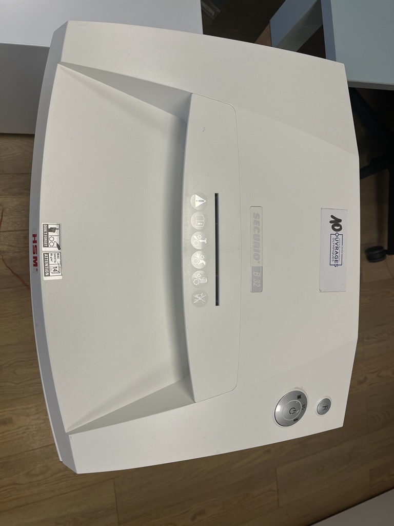 Destructeurs de documents 2 destructeurs de documents à céder. Destructeur Sécurio B32 - P4 - coupe croisée 82 l en particules Norme DIN 66399 75 - Paris Réservé aux personnes publiques jusqu’au 30/10/2025